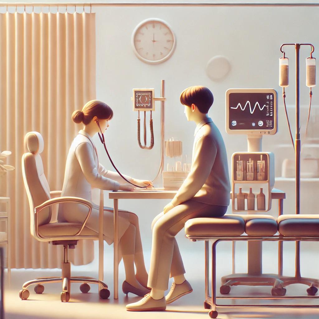 의사가 청진기를 이용하여 심장의 잡음을 확인합니다. 판막 이상이 있을 경우 특이한 잡음(심잡음)이 들릴 수 있습니다.